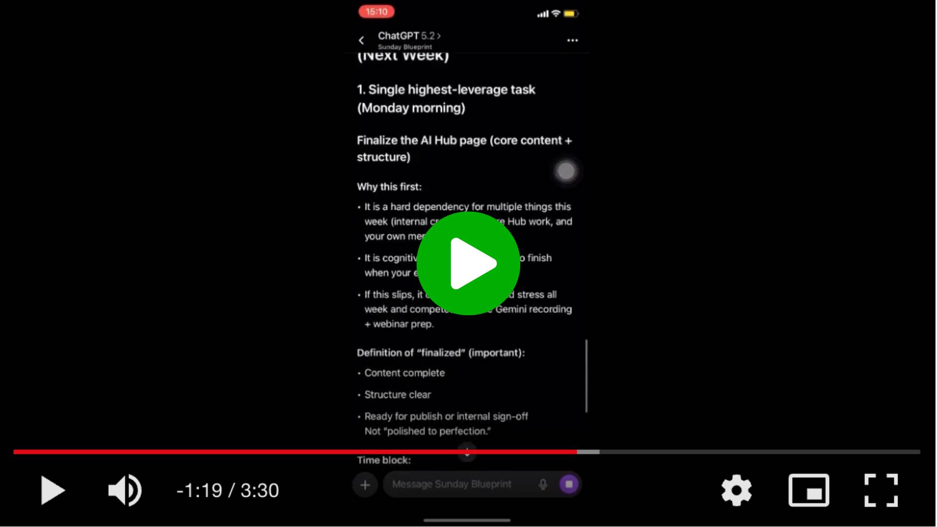 Open ChatGPT Voice on your phone and explain what you are about to do. Tell it that you are going to share everything you have going on and that you want help turning this into a clear, realistic plan for the week ahead. Be explicit that you are not looking for encouragement or generic productivity advice, but for structure and decisions.