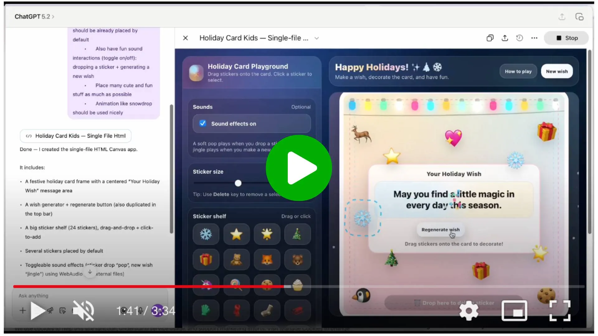 Inspired by that example, the walkthrough below shows how to use GPT-5.2 and Canvas to build a simple interactive holiday card, complete with a warm wishes generator and playful on-screen interactions.