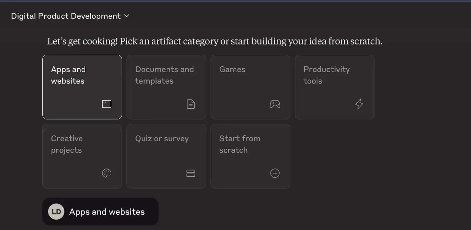 You’ll be asked to pick the type of product you want to make. Since we’re building a full-stack app, choose “Apps and websites.”
