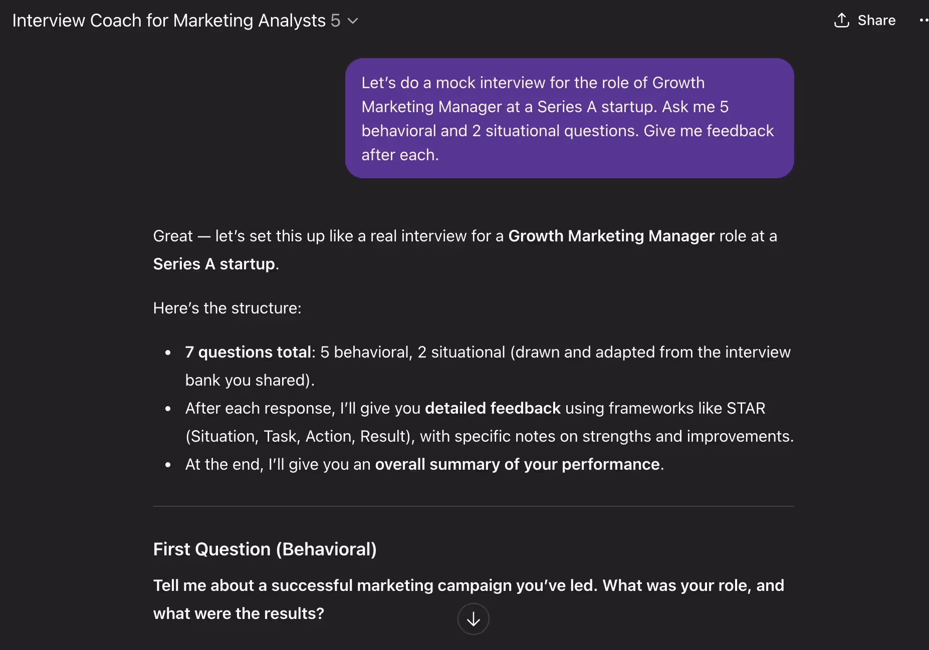 “Let’s do a mock interview for the role of Growth Marketing Manager at a Series A startup. Ask me 5 behavioral and 2 situational questions. Give me feedback after each.”