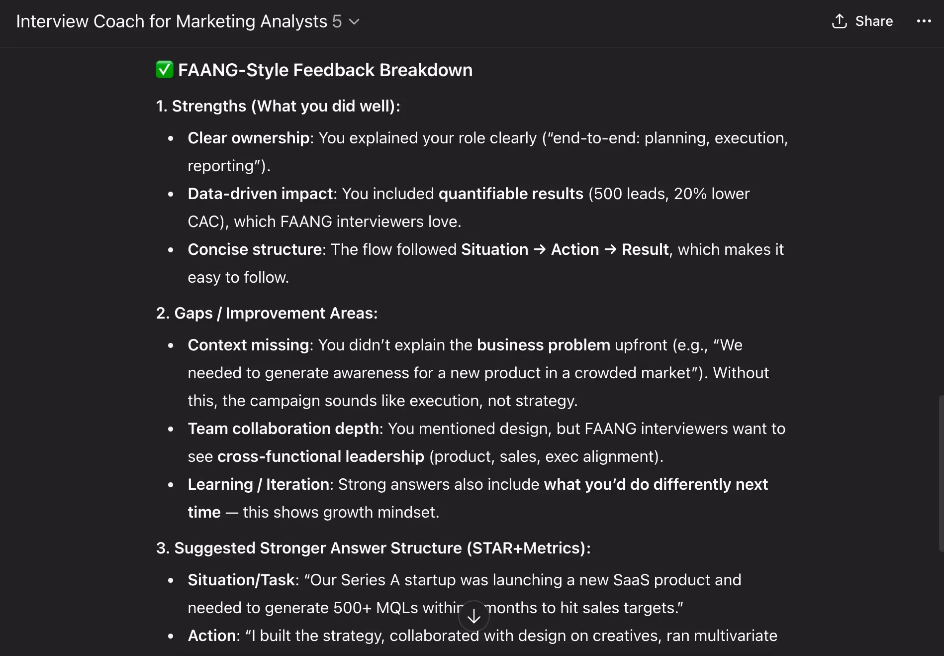 You just created a 24/7 interview coach! No scheduling or awkward Zooms, now you can have fast, focused, personalized feedback from your own AI.