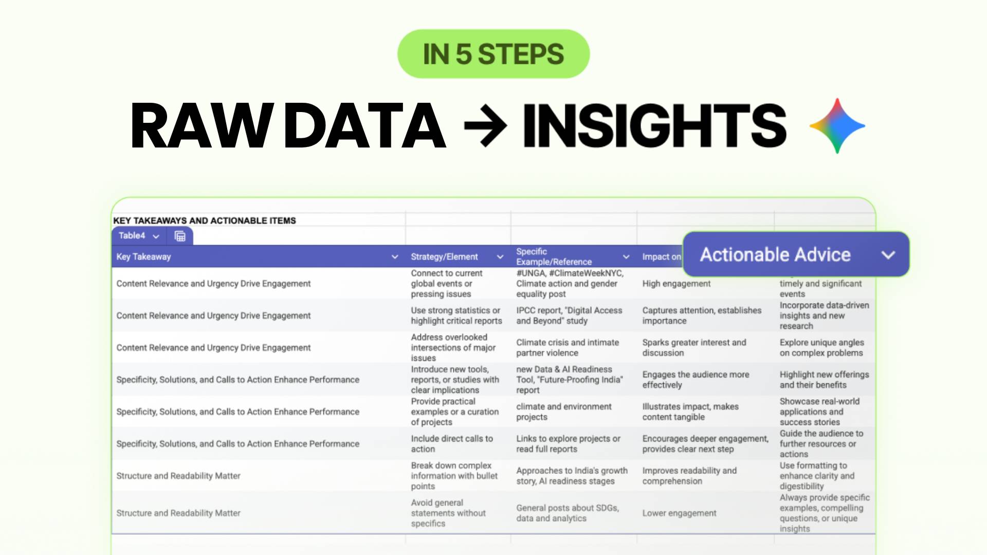- Then ask: “Add a new column with key learnings from each post explaining why it performed better than others.”