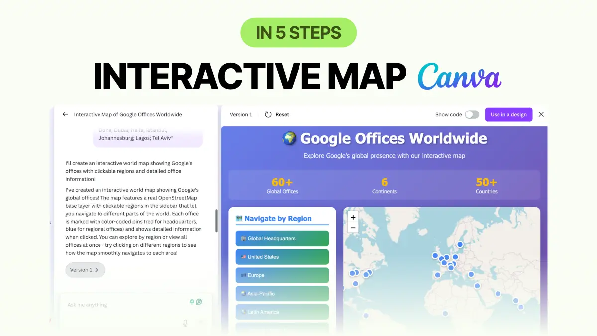 Canva AI’s Code for me turns that idea into reality, helping you create interactive visuals that keep people engaged, without needing to code. One of the best examples: building a live world map where your audience can explore office locations by region, like Google’s global footprint.