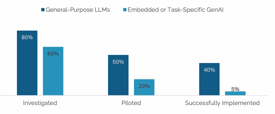 Over 70% of generative AI budgets flow into sales and marketing tools, with low ROI. Higher-impact areas, like back-office automation, logistics, and fraud detection, are underfunded.