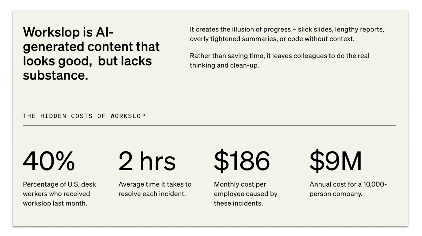According to the research, businesses are slowing down due to Workslop: AI-generated business content that looks polished but moves nothing forward, and shifts effort to the receiver.