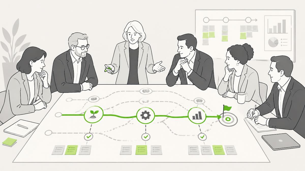 The closing workshop, held 4 to 8 weeks post-cohort, produces a rollout plan with 3, 6, and 12-month milestones.